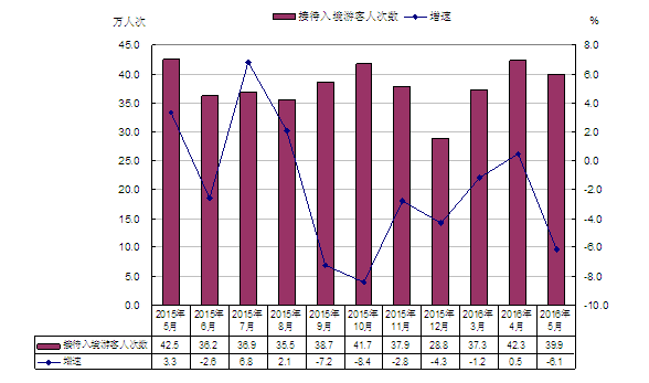 From major tourists, in the first five months, American tourists at home and abroad has received 285000, up 5.5%; South Korean visitors 157000 person-time, fell by 10.5%; Japanese visitors 92000 person-time, 7.4% decline.