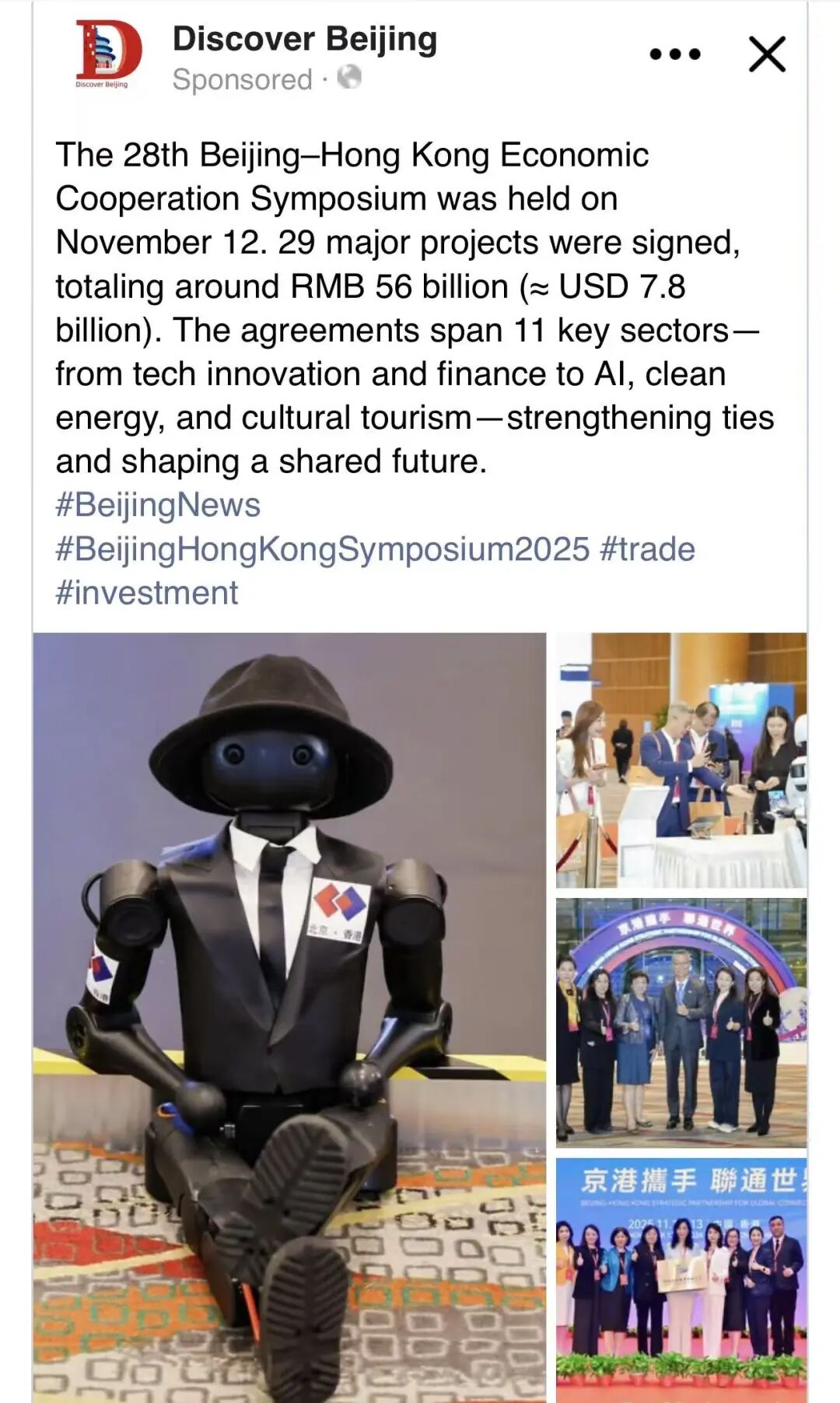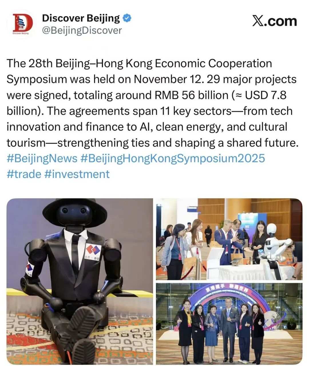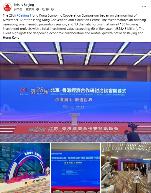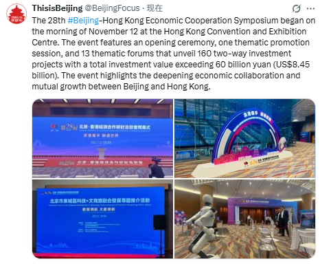 11月12日,第28届北京·香港经济合作研讨洽谈会在香港会展中心隆重开幕,不仅达成多项重磅合作,更在海外社交平台掀起热议浪潮!多家国际账号密集报道此次盛会,重点关注双向投资规模超600亿元、涉及金融、科创、人工智能等前沿领域的160个合作项目。这场跨越南北的“双城对话”,正以开放与创新的姿态,向世界展示中国区域合作的强劲动能!