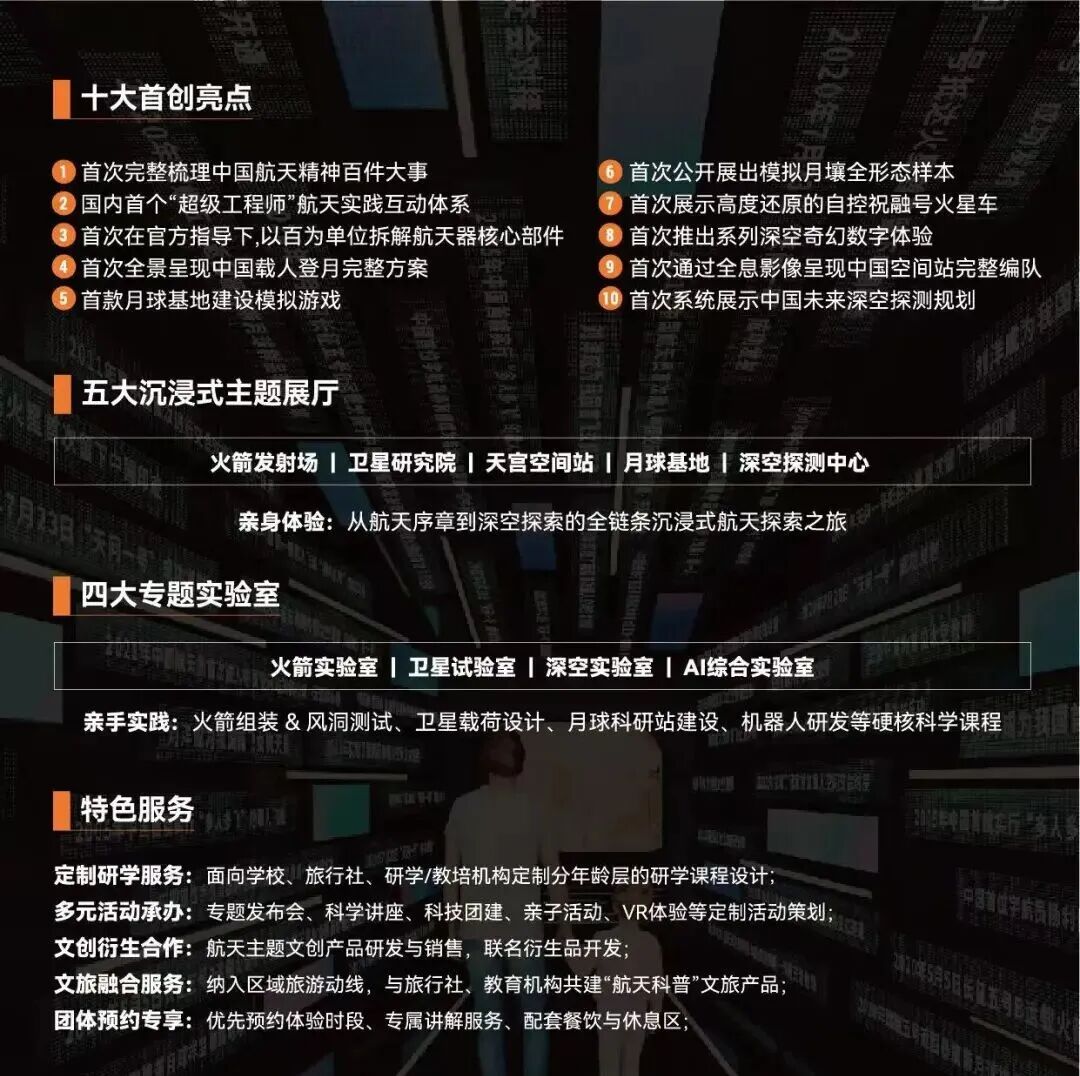 同时配套火箭实验室、卫星实验室、深空实验室等四大专题实验室,首次引入国内航天科研设备并完成全面拆解展示,还将原创打造火星基地体验区,让青少年在火星盖房、火星采矿等趣味互动中,沉浸式感受航天探索的魅力。