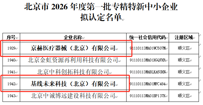 近日,科创集团所属科创汇园入驻企业京赫医疗器械(北京)有限公司、基线未来科技(北京)有限公司成功入选北京市2026年第一批专精特新中小企业名单。