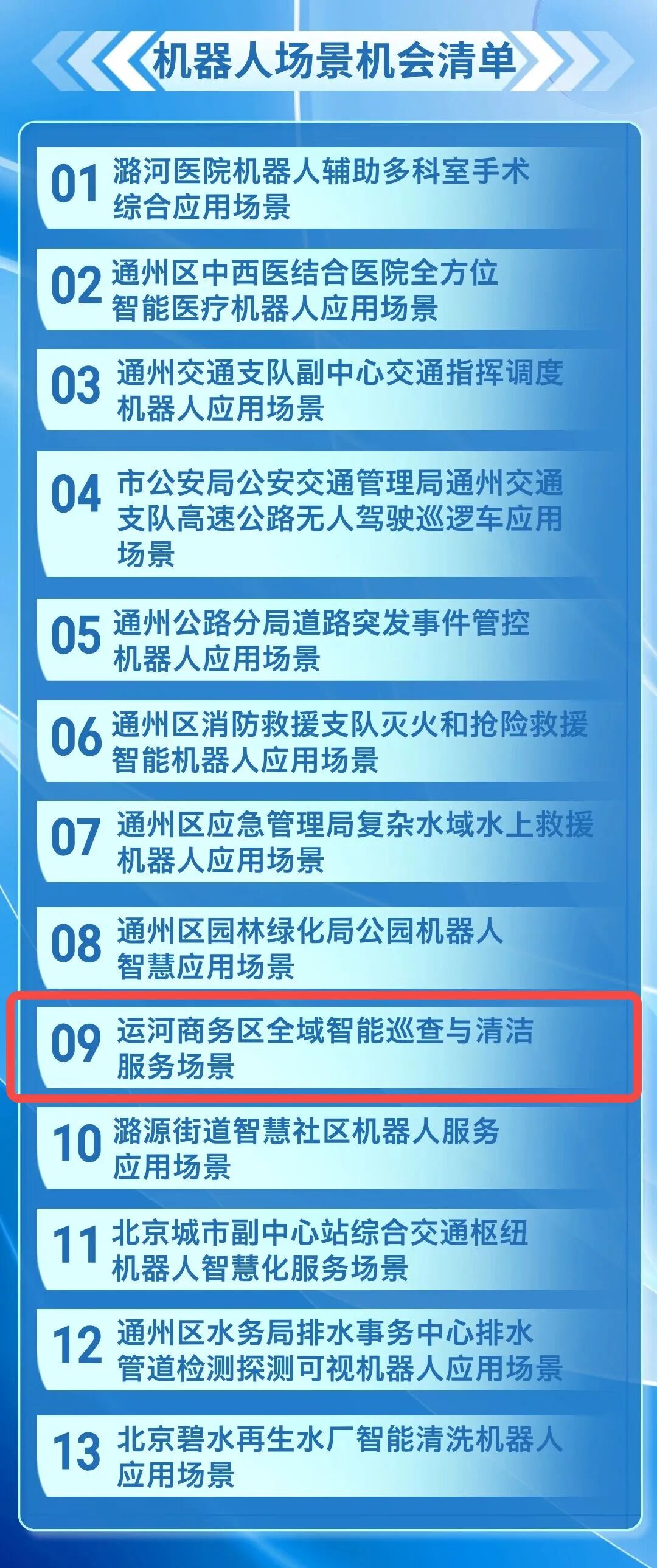 其中,13项场景机会涵盖智慧医疗、智慧交通、应急救援、城市治理、智慧水务五大领域。6项场景能力聚焦先进制造、智慧医疗和城市服务三大方向。其中,运河商务区的全域智能巡查与清洁服务场景,被纳入13项场景机会清单之中。