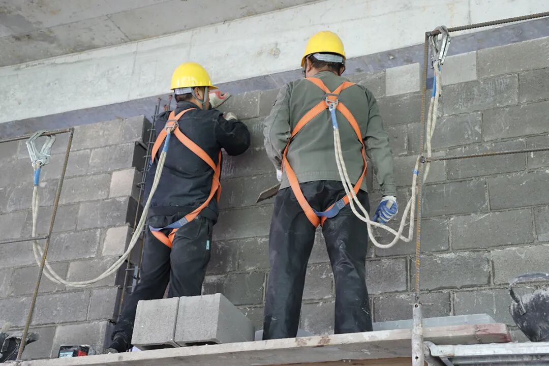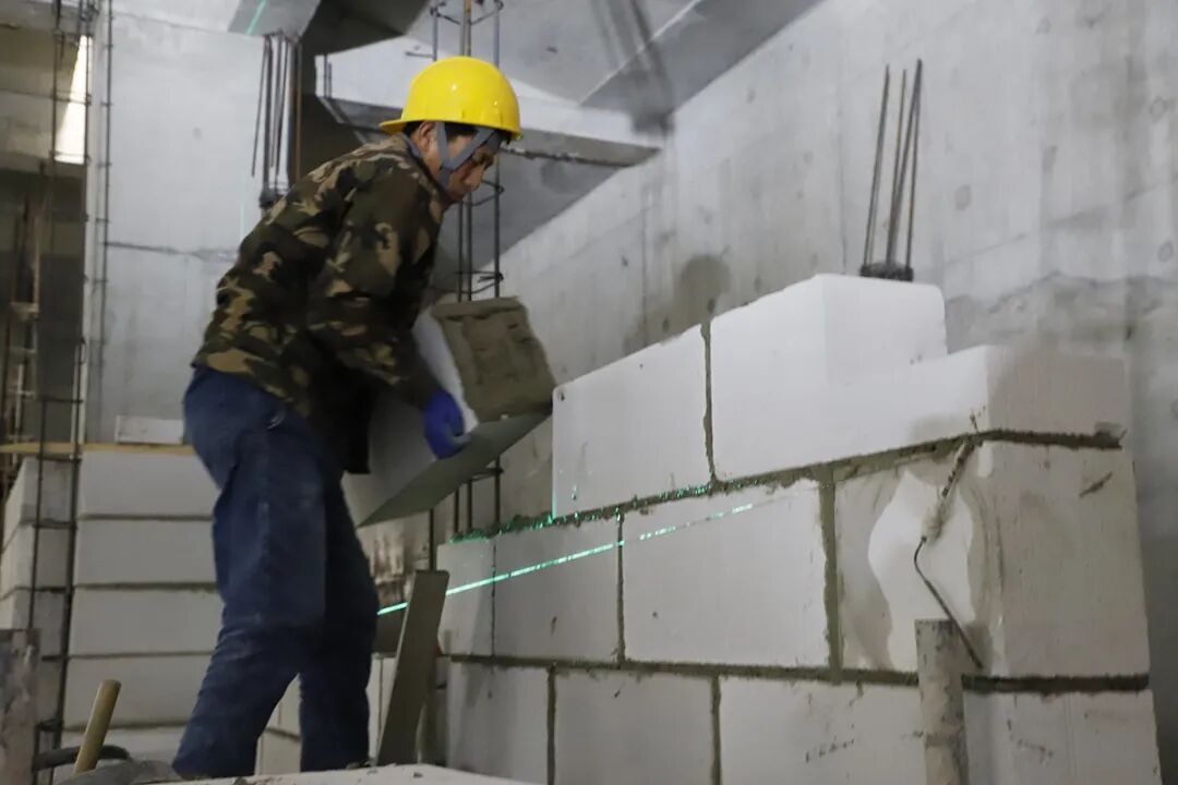 记者在施工现场看到,项目主体结构已全面完工,当前正全力推进二次结构墙体砌筑。在三层作业面,施工人员借助激光投线仪精准弹出墙体垂直控制线,随后将专用砂浆均匀涂抹在加气混凝土砌块表面,并将砌块精准嵌合在控制线范围内。在地下一层、二层作业面,墙体构造柱的钢筋骨架搭建工作同步开展,纵横交错的钢筋被有序绑扎、定位,为后续浇筑混凝土筑牢“骨架”。