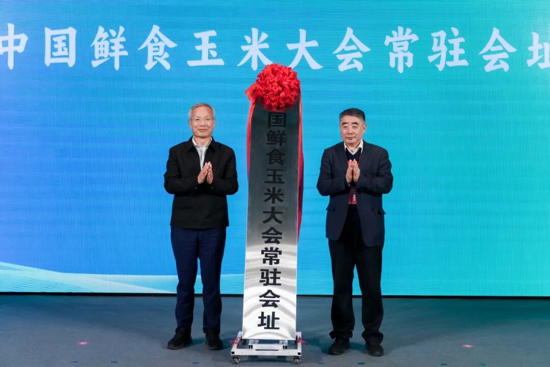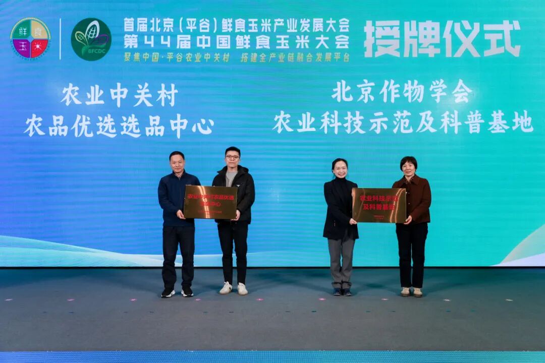平谷区委书记唐海龙与北京市农林科学院玉米首席科学家、中国鲜食玉米产业创新联盟理事长赵久然共同为中国鲜食玉米大会常驻会址揭牌,平谷区商务局局长王腾飞为农业中关村农品优选选品中心授牌,北京作物学会秘书长王卫红为北京作物学会农业科技示范及科普基地授牌。