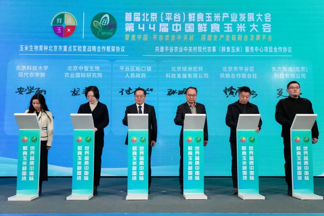 峪口镇人民政府与相关单位签署共建平谷农业中关村现代农事(鲜食玉米)服务中心项目合作协议;北京中智生物农业国际研究院与北京科技大学现代农学院签署玉米生物育种北京市重点实验室战略合作框架协议;农科玉集团与峪口镇签署战略合作协议;相关单位签署共建“金三角”农业科技成果转化平台战略合作协议;北京市农业投资有限公司签署平谷农业中关村金融综合服务框架协议。涵盖种质创新、产业服务、金融赋能、成果转化等关键领域多组重磅合作项目集中签约。