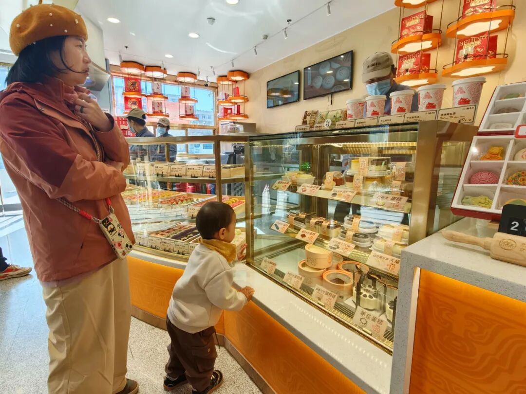 “妈妈,你看这个小马的造型,好可爱!”在隆福寺街区北京稻香村(零号寻宝馆),接过店员递来的小马慕斯蛋糕,5岁的珊珊兴奋地举到镜头前,让家人记录下这一趣味时刻。