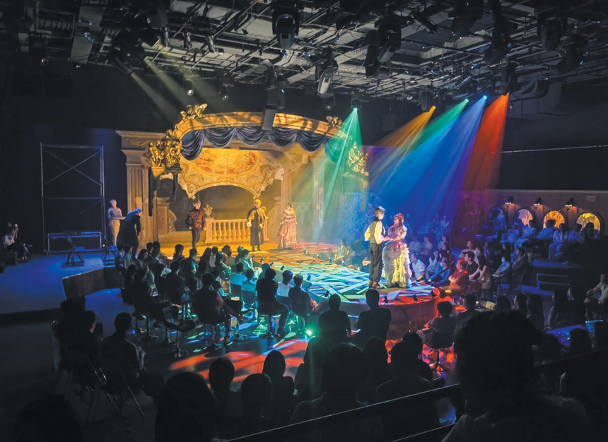 位于隆福寺东院的开心麻花A99剧场,在保留“麻花基因”的基础上,从舞美和装置设计方面进行迭代焕新。不同于以往的传统舞台,剧场无柱通高近7米,在座席中穿插部分舞台置景,打破了传统舞台与观众的边界。随着剧场的升级,开心麻花首部爆笑戏中戏《莎士比亚别生气》也在这里与观众见面。舞台上发生了什么,惹得莎士比亚都要生气?原来是《罗密欧与朱丽叶》公演夜,秒变大型翻车现场。不仅看剧,还能参演,这让走出剧场的观众大呼过瘾!