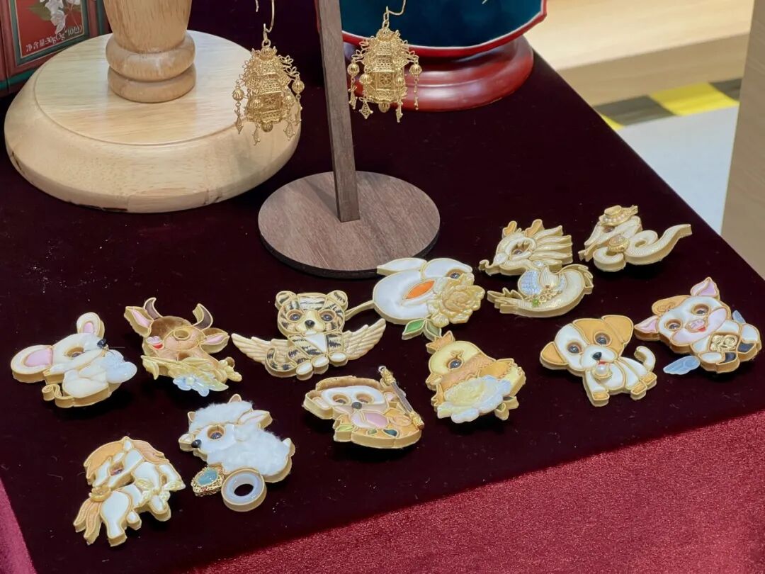 展台上,十二生肖盘扣胸针个个憨态可掬,吸引着大家的目光。这是瑞蚨祥带来的文创胸针。瑞蚨祥中式服装手工制作技艺已传承了一百多年,从选料到成衣制作始终坚持“一条龙”服务,制作技艺秉承了独家百年的传统工艺,制作一件旗袍大的工序有16道,细化工序百余道,制作工艺展示出独特的京派风格。
