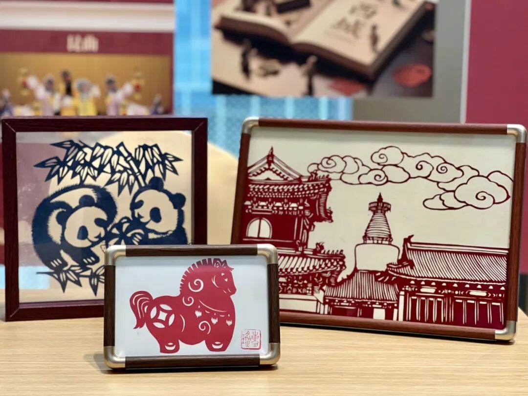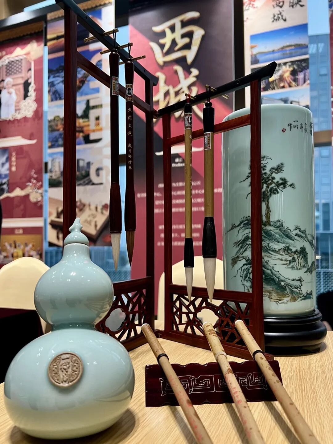 一得阁与戴月轩携手而来,带来墨汁制作技艺与湖笔制作技艺。一得阁墨汁以其墨迹光亮、香味浓厚而闻名,戴月轩湖笔则恪守“尖、齐、圆、健”的制笔准则,凝聚着匠人对传统工艺的极致追求,堪称文房四宝中的精品之作。笔墨旁,是北京刻瓷作品《观山览胜》帽筒,刻瓷工艺以刀代笔,在瓷器的釉面上进行镌錾,达到“触有手感、观有笔墨”的艺术效果。