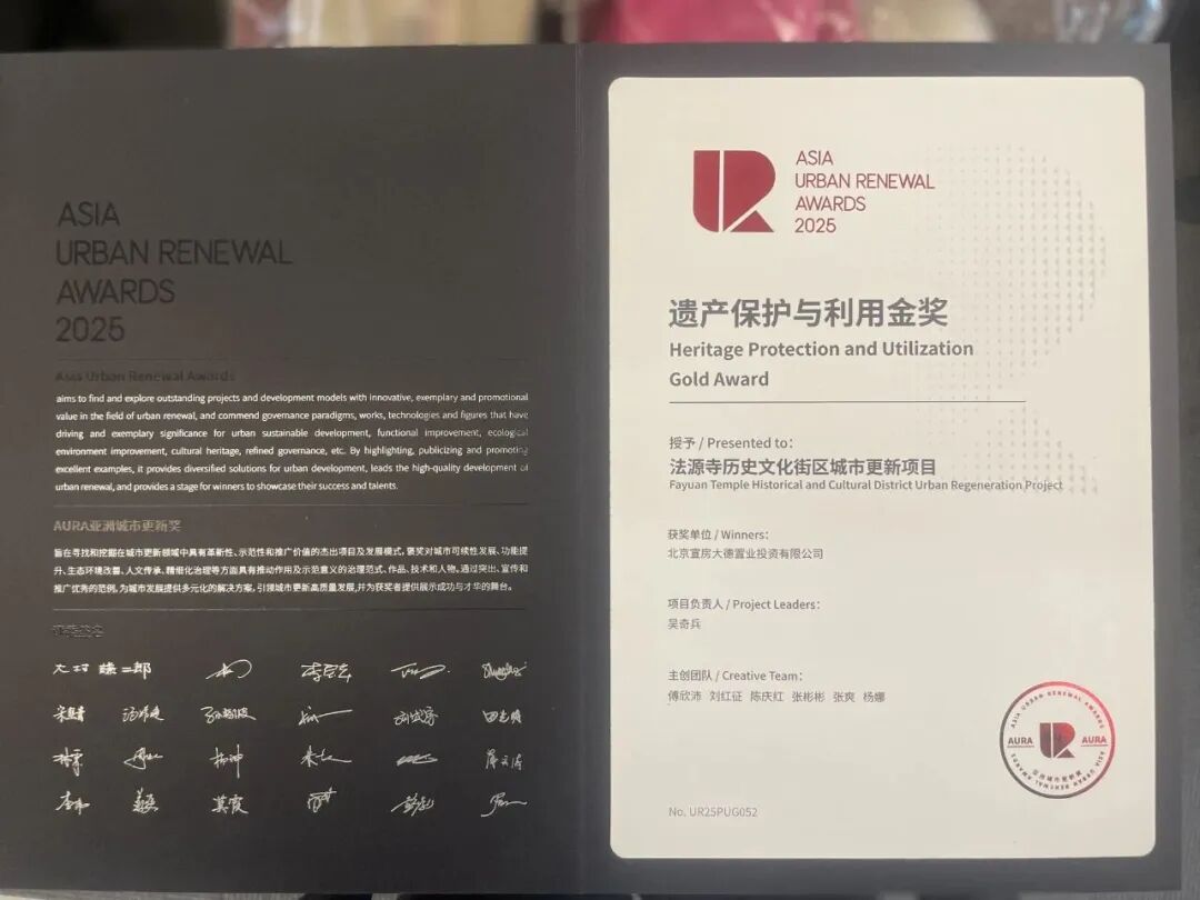 近日,“2025年度AURA亚洲城市更新奖”获奖名单重磅揭晓!北京宣房大德置业投资有限公司(以下简称“宣房大德公司”)申报的法源寺历史文化街区城市更新项目,以卓越的遗产守护与创新活化实践,荣获2025年度AURA亚洲城市更新奖——遗产保护与利用金奖,为城市更新写下“让历史活起来、让民生暖起来”的鲜活注脚。