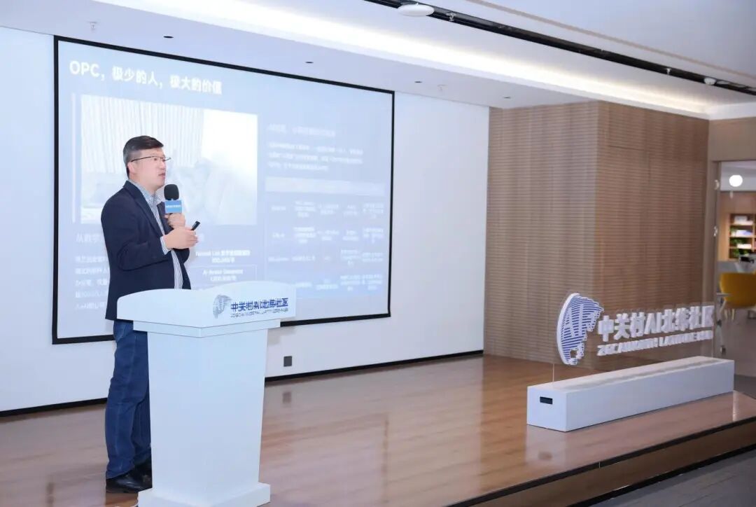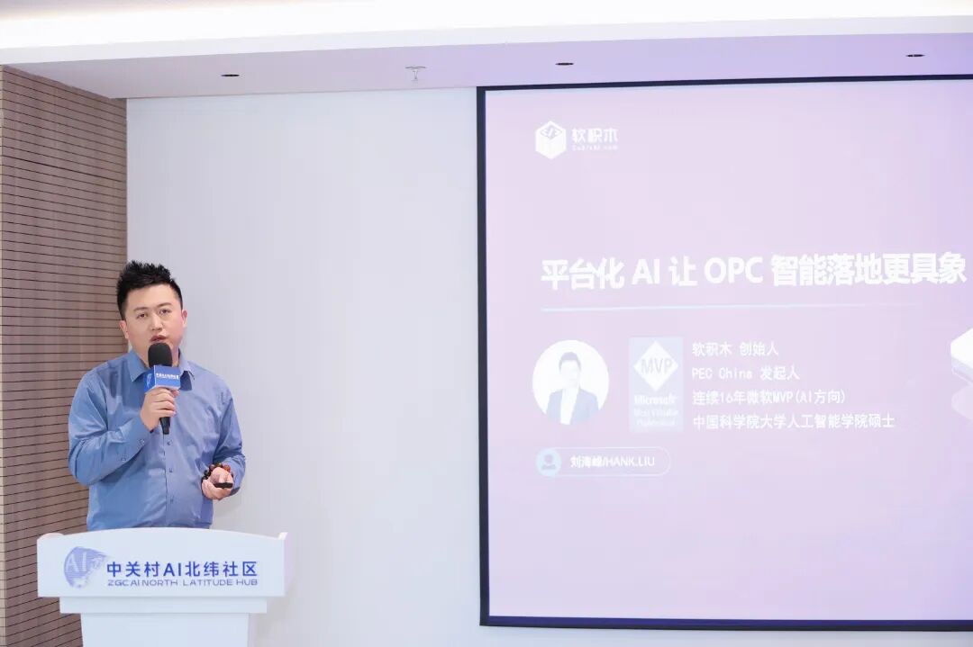 中国科学院大学校友企业、微软AI方向全球最有价值专家(MVP)、PEC China发起人、中关村AI北纬社区入驻企业软积木创始人刘海峰作为生态伙伴代表,以《平台化AI让OPC智能落地更具象》为题分享了实战经验。他结合实际运营经验指出,平台化AI正在为OPC创业者及各类科技园区注入新的增长动能。依托多引擎、多模态的能力底座,OPC创业者能够大幅降低技术门槛,以更低成本、更高效率完成智能化升级;对科技园区而言,这种可复制、可规模化的AI能力供给,不仅提升了园区的创新产出与项目落地速度,也有助于形成可持续的智能产业集聚效应。