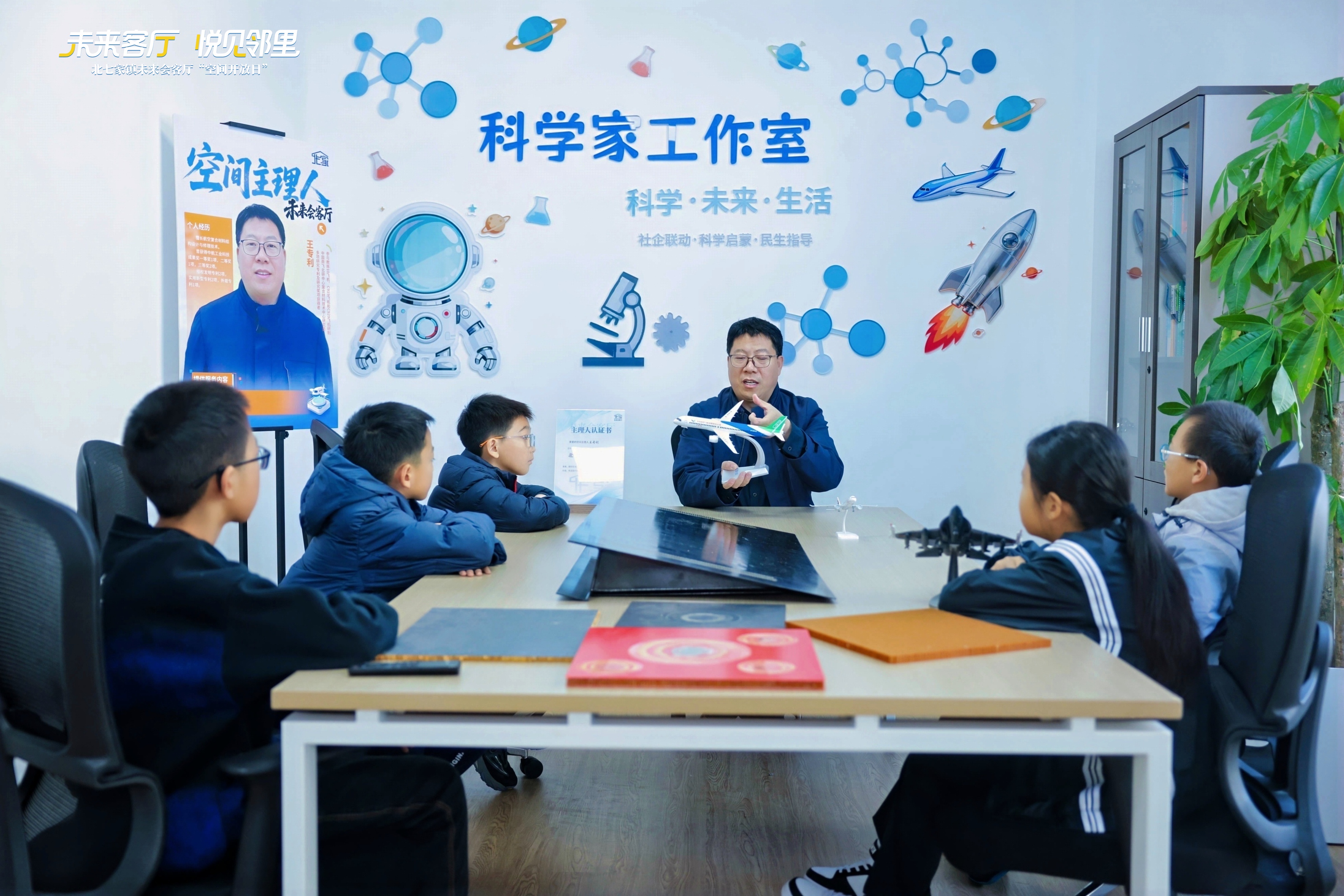 前些天,新晋成为北七家镇未来会客厅主理人的中国商飞北研中心研究员王专利,主动策划了“航空模型展”活动,从飞机材料特性到飞行安全常识,把专业知识转化为孩子能听懂的趣味内容。“以前觉得科研离生活很远,现在作为主理人,能在会客厅给孩子们播撒科学种子,看着他们眼里的好奇与兴奋,我真切感受到基层服务的价值。”王专利说。