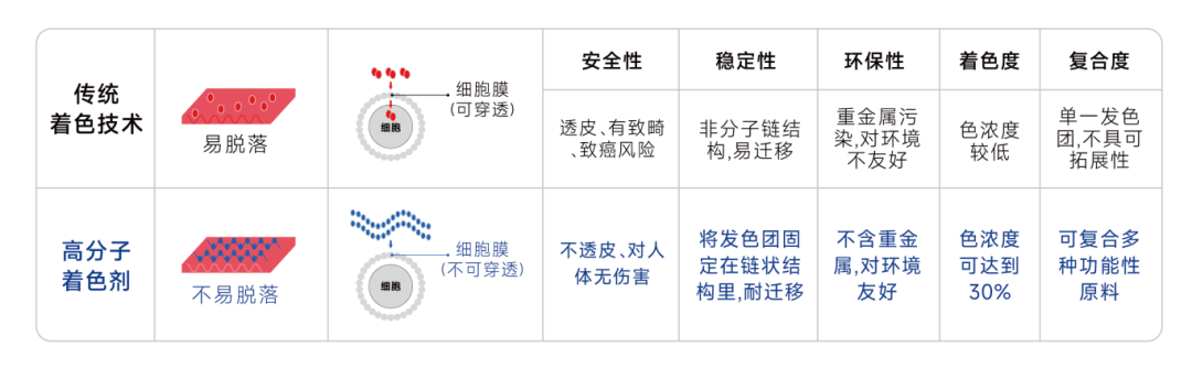 传统小分子着色剂因分子量小、易透皮吸收、不稳定等问题,长期困扰化妆品行业。安色®洛神朱采用全球领先的第四代水性聚氨酯合成技术,通过将发色基团以共价键形式牢固嵌入高分子骨架,形成分子量远超皮肤渗透阈值的稳定结构,从根本上突破了传统着色剂的安全瓶颈,开创了“非透皮着色”的全新技术路径。