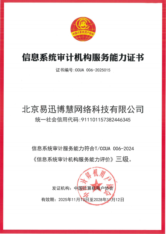 近日,经中国计算机用户协会严格评审,大兴投资二级公司易迅博慧公司凭借其在信息化领域突出的表现,成功获得信息系统审计机构服务能力三级证书。这一重量级资质的取得,标志着该公司在信息系统审计领域具备规范化的服务流程、专业的技术团队和成熟的方法论,为大兴企业在数字化服务赛道再添重要竞争力。