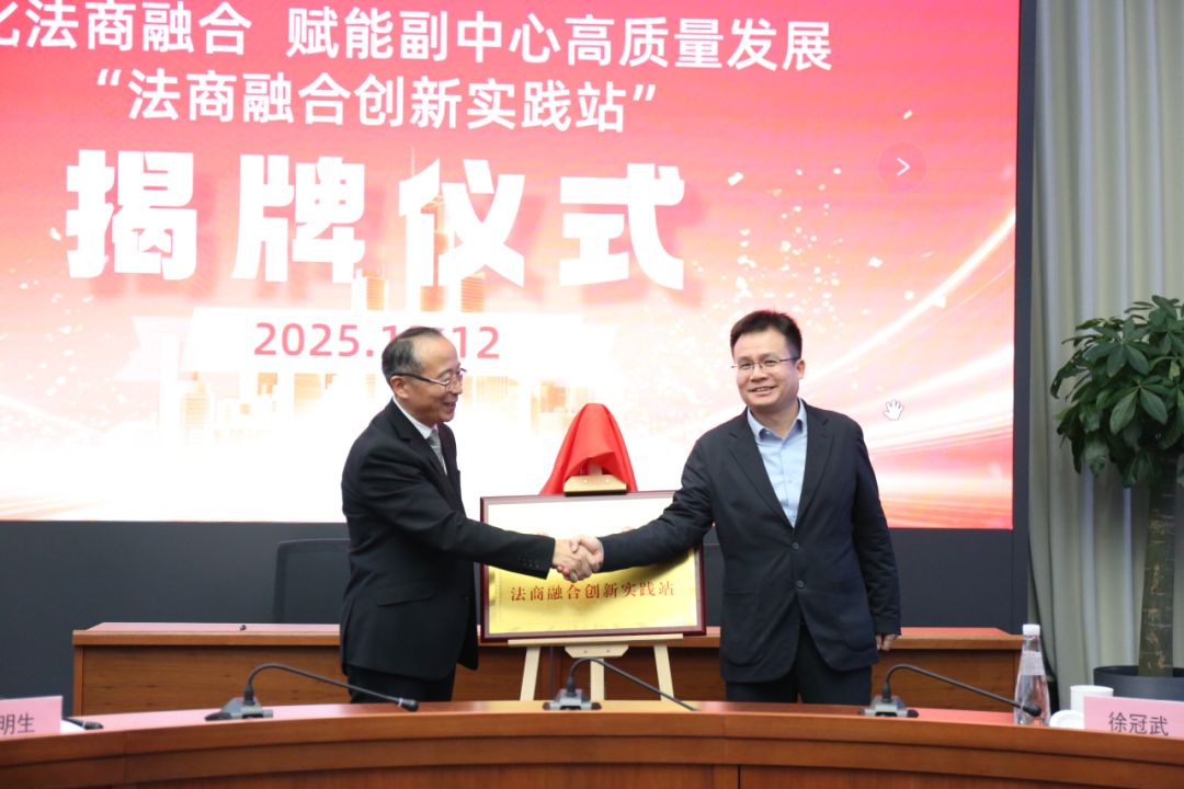 会上,商学院领导通报合作协议主要内容后,双方领导签署协议,共同为“法商融合创新实践站”揭牌。
