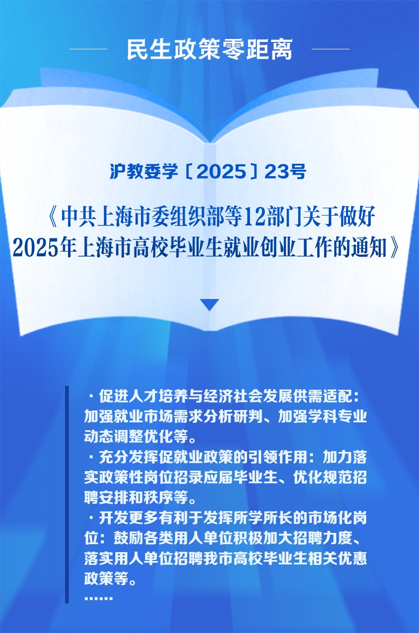 《中共上海市委组织部等12部门关于做好2025年上海市高校毕业生就业创业工作的通知》围绕“促进人才培养与经济社会发展供需适配”“充分发挥促就业政策的引领作用”等内容推出多项具体举措,促进高校毕业生高质量充分就业。